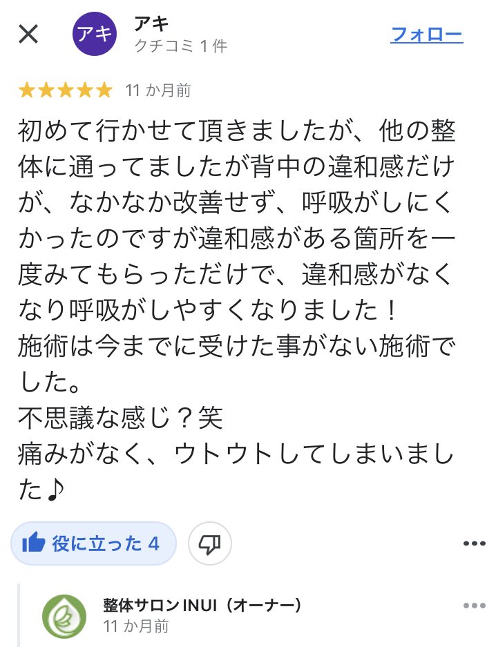 お客様の声 背中の違和感、呼吸のしづらさ(40代女性) 2022.01.05 Tweet Share Hatena Pocket RSS feedly Pin it この記事のタイトルとURLをコピーする 【当院のGoogleレビューより引用】 (以下文字起こし) 初めて行かせていただきましたが、他の整体に通ってましたが背中の違和感だけが、なかなか改善せず、呼吸がしにくかったのですが違和感がある箇所を一度見てもらっただけで、違和感がなくなり呼吸がしやすくなりました!施術は今までに受けたことがない施術でした。不思議な感じ。痛みがなく、ウトウトしてしまいました。 ※個人の感想です。全ての方に効果を保証するものではありません。 【記事作成者 整体サロンINUI(新大阪・西中島南方)】 乾 裕樹 大阪府出身 1990年9月11日生まれ 血液型 A型 明治東洋医学院専門学校 鍼灸学科卒業 取得国家資格 はり師・きゅう師 一般社団法人 日本統合手技協会 理事 一般社団法人 日本統合手技協会 公認インストラクター 京都府立医科大学 解剖実習修了 (施術家としての経歴) 高校卒業後、18歳で施術家の道へ。 午前は鍼灸の専門学生として学び、午後は地元の鍼灸整骨院で夜遅くまで勤務。 主に運動器疾患やスポーツ障害についての理論や施術方法を習得する。 ↓ 専門学校卒業後は不妊症を専門とする鍼灸院にて修行。 婦人科疾患や逆子の施術、小児はり、自律神経失調症の方々へのアプローチ、東洋医学的な診察方法について学ぶ。 お客様への接遇や仕事に対する姿勢など、社会人としての基礎を教えて頂く。 ↓ 内臓へのアプローチを専門とする整体サロンにて修行。 肩こりや腰痛などをはじめとする身体の痛みと、内臓の問題が関連することを学ぶ。 それと同時に、筋肉を揉んだりほぐすだけでは根本的には良くならないことを知る。 ↓ 妊産婦のお悩みを専門に扱う整体サロンにて修業。 産後骨盤矯正やマタニティ整体を通して、産後ママや妊婦の身体の状態について学ぶ。 その他、発達の遅れやチックなどの小児整体、美容鍼・小顔矯正のテクニックを習得。 26歳で同サロンの分院長に就任。 約4年にわたり代表セラピストとして全ての施術メニューを担当し、所属スタッフの技術指導・育成に携わる。 ↓ これまでの技術・経験だけでは改善できない症状に数多く巡り合い、施術家としての頭打ちを感じる。 そんな折、現在の師匠である松本恒平と出会う。 多くの施術家が見落としている原理原則、触診、国際基準の療術について学び、これまで習得した技術や知識のバラバラだった”点”が”線”で繋がる。 それをきっかけに、辛い症状と闘う人たちの力になれることを確信し地元である新大阪・南方エリアにて開業。 Facebook Twitter Contact Tweet Share Hatena Pocket RSS feedly Pin it この記事のタイトルとURLをコピーする 投稿者: 乾 裕樹 お客様の声, 肩・首の症状, 腰周りの症状, 頭・顔・耳の症状, 自律神経の症状, 婦人科の症状 コメント: 0 「産後の肩こり・歯の痛みが和らぎました」(30代女性) 前の記事 骨盤の歪み、姿勢のアンバランス(60代女性) 次の記事