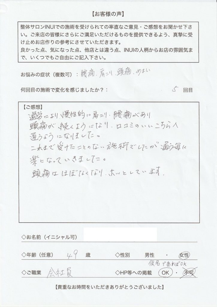 お客様の声 頭痛がなくなりホッとしています(49歳女性 会社員) 2022.04.11 Tweet Share Hatena Pocket RSS feedly Pin it この記事のタイトルとURLをコピーする お悩みの症状: 腰痛、肩こり、頭痛、めまい 【ご感想】 過労により、慢性的に肩こり・腰痛があり頭痛が続くようになり口コミの良いこちらへ通うようになりました。これまで受けたことのない施術でしたが通う毎に楽になっていきました。頭痛はほぼなくなり、ホッとしています。 ※実際のご利用者様の体験談であり、効果を保証するものではありません。 【記事作成者 整体サロンINUI(新大阪・西中島南方)】 乾 裕樹 大阪府出身 1990年9月11日生まれ 血液型 A型 明治東洋医学院専門学校 鍼灸学科卒業 取得国家資格 はり師・きゅう師 一般社団法人 日本統合手技協会 理事 一般社団法人 日本統合手技協会 公認インストラクター 京都府立医科大学 解剖実習修了 (施術家としての経歴) 高校卒業後、18歳で施術家の道へ。 午前は鍼灸の専門学生として学び、午後は地元の鍼灸整骨院で夜遅くまで勤務。 主に運動器疾患やスポーツ障害についての理論や施術方法を習得する。 ↓ 専門学校卒業後は不妊症を専門とする鍼灸院にて修行。 婦人科疾患や逆子の施術、小児はり、自律神経失調症の方々へのアプローチ、東洋医学的な診察方法について学ぶ。 お客様への接遇や仕事に対する姿勢など、社会人としての基礎を教えて頂く。 ↓ 内臓へのアプローチを専門とする整体サロンにて修行。 肩こりや腰痛などをはじめとする身体の痛みと、内臓の問題が関連することを学ぶ。 それと同時に、筋肉を揉んだりほぐすだけでは根本的には良くならないことを知る。 ↓ 妊産婦のお悩みを専門に扱う整体サロンにて修業。 産後骨盤矯正やマタニティ整体を通して、産後ママや妊婦の身体の状態について学ぶ。 その他、発達の遅れやチックなどの小児整体、美容鍼・小顔矯正のテクニックを習得。 26歳で同サロンの分院長に就任。 約4年にわたり代表セラピストとして全ての施術メニューを担当し、所属スタッフの技術指導・育成に携わる。 ↓ これまでの技術・経験だけでは改善できない症状に数多く巡り合い、施術家としての頭打ちを感じる。 そんな折、現在の師匠である松本恒平と出会う。 多くの施術家が見落としている原理原則、触診、国際基準の療術について学び、これまで習得した技術や知識のバラバラだった”点”が”線”で繋がる。 それをきっかけに、辛い症状と闘う人たちの力になれることを確信し地元である新大阪・南方エリアにて開業。 Facebook Twitter Contact Tweet Share Hatena Pocket RSS feedly Pin it この記事のタイトルとURLをコピーする 投稿者: 乾 裕樹 お客様の声, 肩・首の症状, 腰周りの症状, 頭・顔・耳の症状, 自律神経の症状, 婦人科の症状 コメント: 0 腰痛、首のしびれ、膝の痛み(69歳 男性 臨時職員) 前の記事 脊柱管狭窄症と診断を受けた足のしびれ、腰痛(65歳 男性 会社員) 次の記事