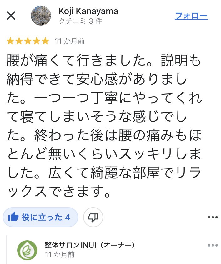 お客様の声 「腰の痛みが無くなりました」(40代男性) 2022.01.05 Tweet Share Hatena Pocket RSS feedly Pin it この記事のタイトルとURLをコピーする 【当院のGoogleレビューより引用】 (以下文字起こし) 腰が痛くて行きました。説明も納得できて安心感がありました。一つ一つ丁寧にやってくれて寝てしまいそうな感じでした。終わった後は腰の痛みもほとんど無いくらいスッキリしました。広くて綺麗な部屋でリラックスできます。 ※個人の感想です。全ての方に効果を保証するものではありません。 【記事作成者 整体サロンINUI(新大阪・西中島南方)】 乾 裕樹 大阪府出身 1990年9月11日生まれ 血液型 A型 明治東洋医学院専門学校 鍼灸学科卒業 取得国家資格 はり師・きゅう師 一般社団法人 日本統合手技協会 理事 一般社団法人 日本統合手技協会 公認インストラクター 京都府立医科大学 解剖実習修了 (施術家としての経歴) 高校卒業後、18歳で施術家の道へ。 午前は鍼灸の専門学生として学び、午後は地元の鍼灸整骨院で夜遅くまで勤務。 主に運動器疾患やスポーツ障害についての理論や施術方法を習得する。 ↓ 専門学校卒業後は不妊症を専門とする鍼灸院にて修行。 婦人科疾患や逆子の施術、小児はり、自律神経失調症の方々へのアプローチ、東洋医学的な診察方法について学ぶ。 お客様への接遇や仕事に対する姿勢など、社会人としての基礎を教えて頂く。 ↓ 内臓へのアプローチを専門とする整体サロンにて修行。 肩こりや腰痛などをはじめとする身体の痛みと、内臓の問題が関連することを学ぶ。 それと同時に、筋肉を揉んだりほぐすだけでは根本的には良くならないことを知る。 ↓ 妊産婦のお悩みを専門に扱う整体サロンにて修業。 産後骨盤矯正やマタニティ整体を通して、産後ママや妊婦の身体の状態について学ぶ。 その他、発達の遅れやチックなどの小児整体、美容鍼・小顔矯正のテクニックを習得。 26歳で同サロンの分院長に就任。 約4年にわたり代表セラピストとして全ての施術メニューを担当し、所属スタッフの技術指導・育成に携わる。 ↓ これまでの技術・経験だけでは改善できない症状に数多く巡り合い、施術家としての頭打ちを感じる。 そんな折、現在の師匠である松本恒平と出会う。 多くの施術家が見落としている原理原則、触診、国際基準の療術について学び、これまで習得した技術や知識のバラバラだった”点”が”線”で繋がる。 それをきっかけに、辛い症状と闘う人たちの力になれることを確信し地元である新大阪・南方エリアにて開業。 Facebook Twitter Contact Tweet Share Hatena Pocket RSS feedly Pin it この記事のタイトルとURLをコピーする 投稿者: 乾 裕樹 お客様の声, 腰周りの症状, 手・足の症状, 自律神経の症状 コメント: 0 「女性1人でも安心して受けられました」(40代女性) 前の記事 「一人一人の身体と向き合ってくれる」(30代男性) 次の記事