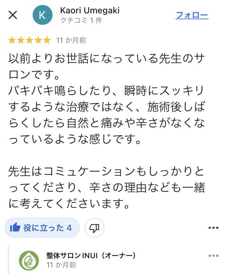 お客様の声 「自然と痛みや辛さがなくなりました」(30代女性) 2022.01.05 Tweet Share Hatena Pocket RSS feedly Pin it この記事のタイトルとURLをコピーする 【当院のGoogleレビューより引用】 (以下文字起こし) 以前よりお世話になっている先生のサロンです。バキバキ鳴らしたり、瞬時にすっきりするような治療ではなく、施術後しばらくしたら自然と痛みや辛さがなくなっているような感じです。先生はコミュニケーションもしっかりとってくださり、辛さの理由なども一緒に考えてくださいます。 ※個人の感想です。全ての方に効果を保証するものではありません。 【記事作成者 整体サロンINUI(新大阪・西中島南方)】 乾 裕樹 大阪府出身 1990年9月11日生まれ 血液型 A型 明治東洋医学院専門学校 鍼灸学科卒業 取得国家資格 はり師・きゅう師 一般社団法人 日本統合手技協会 理事 一般社団法人 日本統合手技協会 公認インストラクター 京都府立医科大学 解剖実習修了 (施術家としての経歴) 高校卒業後、18歳で施術家の道へ。 午前は鍼灸の専門学生として学び、午後は地元の鍼灸整骨院で夜遅くまで勤務。 主に運動器疾患やスポーツ障害についての理論や施術方法を習得する。 ↓ 専門学校卒業後は不妊症を専門とする鍼灸院にて修行。 婦人科疾患や逆子の施術、小児はり、自律神経失調症の方々へのアプローチ、東洋医学的な診察方法について学ぶ。 お客様への接遇や仕事に対する姿勢など、社会人としての基礎を教えて頂く。 ↓ 内臓へのアプローチを専門とする整体サロンにて修行。 肩こりや腰痛などをはじめとする身体の痛みと、内臓の問題が関連することを学ぶ。 それと同時に、筋肉を揉んだりほぐすだけでは根本的には良くならないことを知る。 ↓ 妊産婦のお悩みを専門に扱う整体サロンにて修業。 産後骨盤矯正やマタニティ整体を通して、産後ママや妊婦の身体の状態について学ぶ。 その他、発達の遅れやチックなどの小児整体、美容鍼・小顔矯正のテクニックを習得。 26歳で同サロンの分院長に就任。 約4年にわたり代表セラピストとして全ての施術メニューを担当し、所属スタッフの技術指導・育成に携わる。 ↓ これまでの技術・経験だけでは改善できない症状に数多く巡り合い、施術家としての頭打ちを感じる。 そんな折、現在の師匠である松本恒平と出会う。 多くの施術家が見落としている原理原則、触診、国際基準の療術について学び、これまで習得した技術や知識のバラバラだった”点”が”線”で繋がる。 それをきっかけに、辛い症状と闘う人たちの力になれることを確信し地元である新大阪・南方エリアにて開業。 Facebook Twitter Contact Tweet Share Hatena Pocket RSS feedly Pin it この記事のタイトルとURLをコピーする 投稿者: 乾 裕樹 お客様の声, 肩・首の症状, 腰周りの症状, 手・足の症状, 頭・顔・耳の症状, 自律神経の症状, 産後の症状, 妊娠中の症状, 婦人科の症状 コメント: 0 「先生には1年以上お世話になっています」(40代男性) 前の記事 「腕の痛みがかなり楽になりました」(50代女性) 次の記事